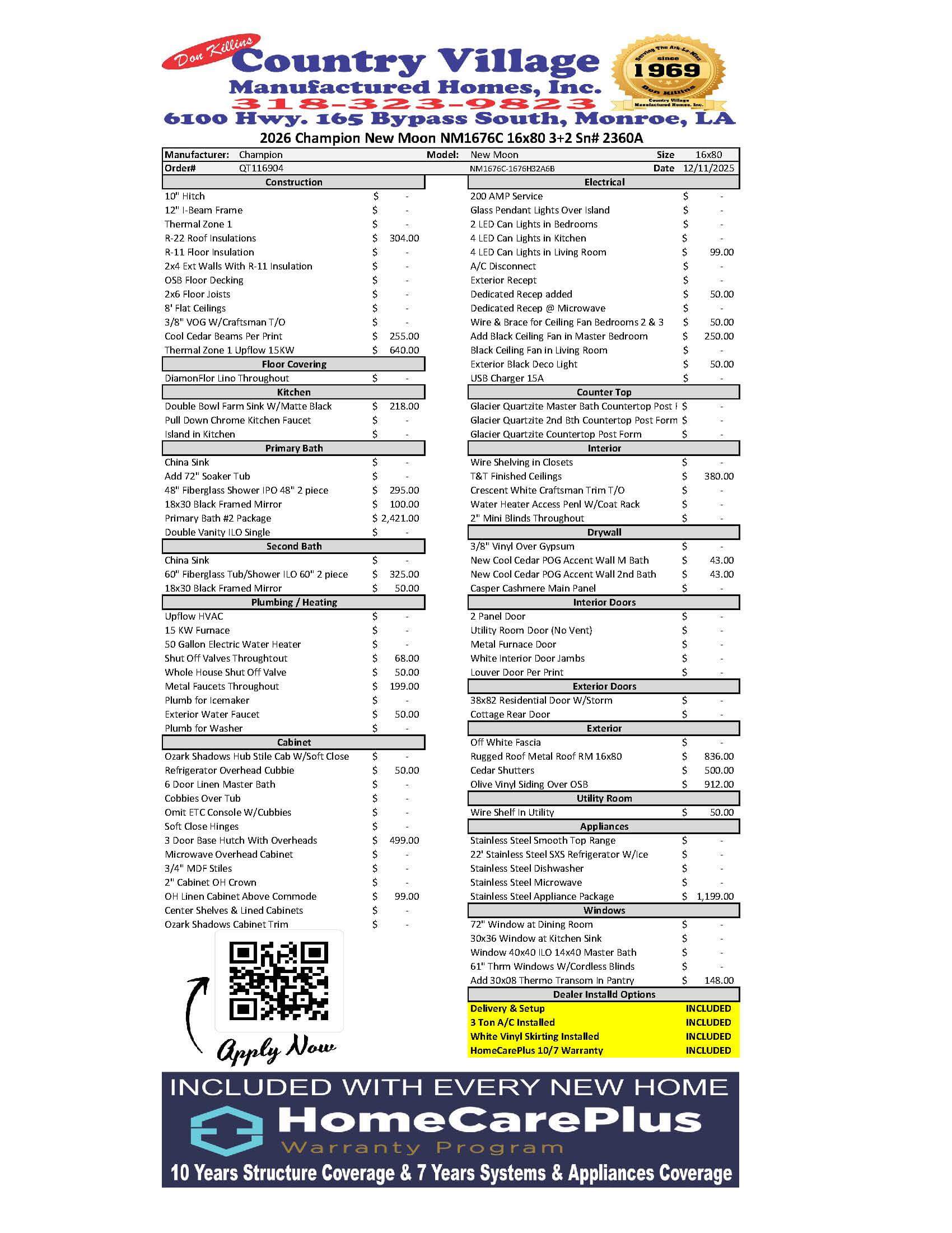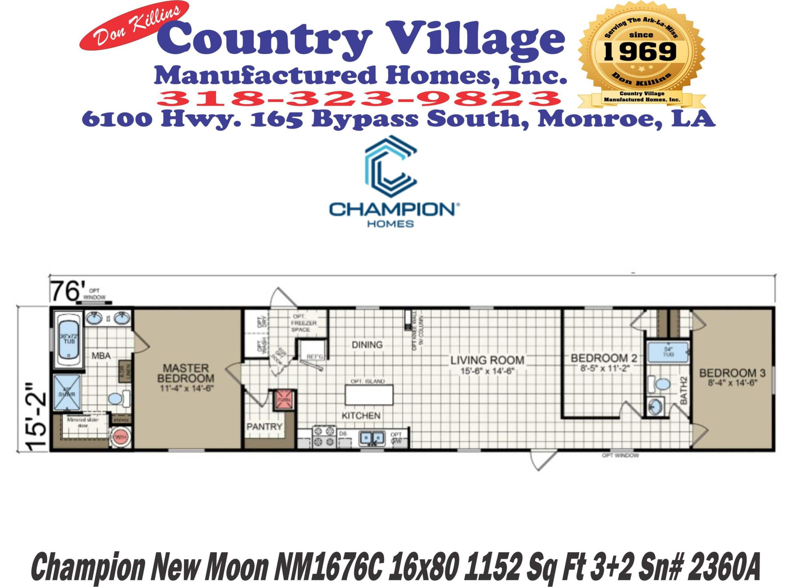 2026 Champion New Moon NM1676C 16x80 1152 Sq Ft 3+2 Sn# 2360A Standard & Optional Features In Home Ready to find out more? Click Here To Drop Us A Line Today For A Free Quote!
